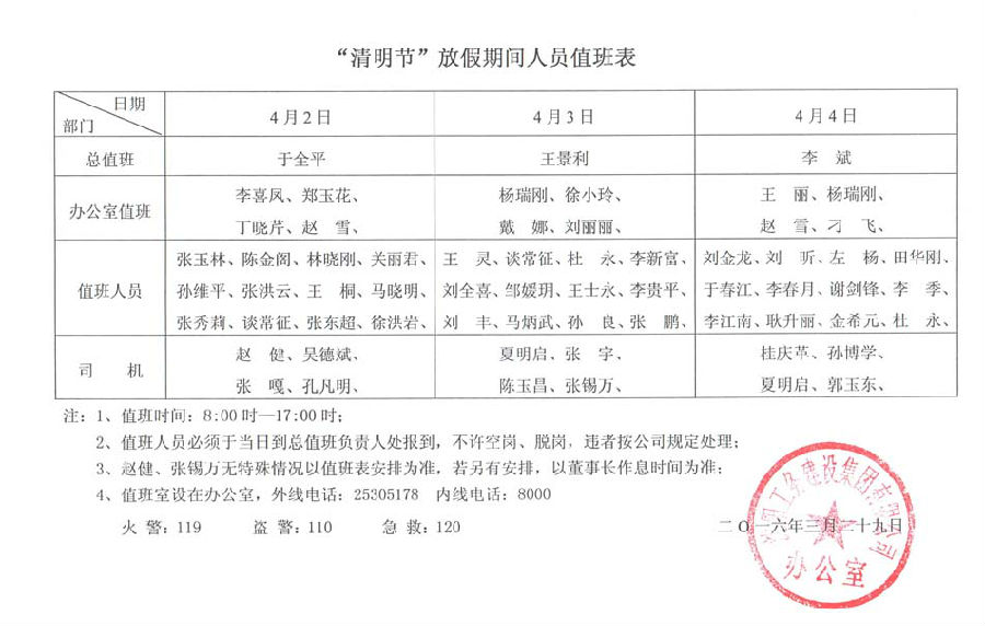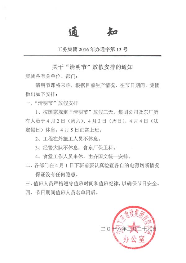 工務集團2016年辦通字第13號《關于“清明節(jié)”放假安排的通知》